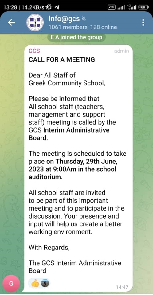 Instead, the Minister has continually smeared Greeks as corrupt, without evidence, to justify his actions and has hastily and eccentrically embarked on the installation of an interim administration of the English section, which has banned entry to the Board members of the Greek Community of AA. And daily he is practicing a regime of intimidation on the staff, teachers, pupils and parents. It also intervenes in actions that concern the Community and not the English section, such as: opening and using the Community’s bank accounts, leaving unpaid 29 employees, racist comments to Greek-Ethiopians to choose whether to be Greek or Ethiopian, attempt to dismiss the Community’s lawyers, trying to prohibit the Community’s social benefits to people in need of such assistance, accounts are blocked and rumors are there that no exit permits to travel abroad will be given the members of the Board of HGCA, etc The intervention extends to the Greek section of the GCS (which are under the Greek Ministry of Education) with unpaid staff (Greek Civil Servants) and various prohibitions, etc. Finally, abusing disruptive actions of a small group (Trojan Horses of the community), an attempt is made to change the composition of the Board of Directors of the Community.