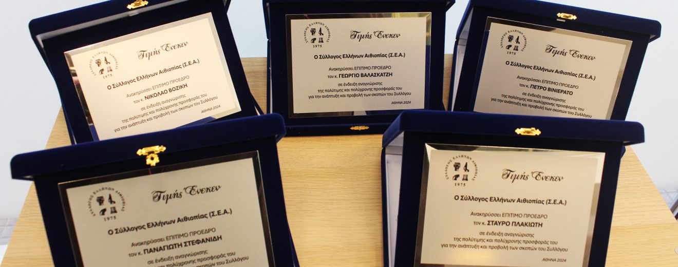 ΤΙΜΗΤΙΚΑ ΔΙΠΛΩΜΑΤΑ ΣΤΟΥΣ 5 ΕΝ ΖΩΗ ΠΡΩΗΝ ΠΡΟΕΔΡΟΥΣ ΟΜΙΛΙΑ ΠΑΡΑΣΚΕΥΗΣ ΜΑΝΟΥΚΑΚΗ, ΠΡΟΕΔΡΟΥ ΤΟΥ Σ.Ε.Α. Ο Σύλλογος Ελλήνων Αιθιοπίας ιδρύθηκε στην Αθήνα, τον Οκτώβριο του 1975, με σκοπό την συγκέντρωση των παλιννοστούντων συμπατριωτών μας της Ελληνικής παροικίας Αιθιοπίας – Ερυθραίας – Τζιμπουτί, για να μην αποξενωθούν μεταξύ τους και να διατηρήσουν αναλλοίωτη την μνήμη τους … Συνεχίστε να διαβάζετε το ΤΙΜΗΤΙΚΑ ΔΙΠΛΩΜΑΤΑ ΣΤΟΥΣ 5 ΕΝ ΖΩΗ ΠΡΩΗΝ ΠΡΟΕΔΡΟΥΣ.