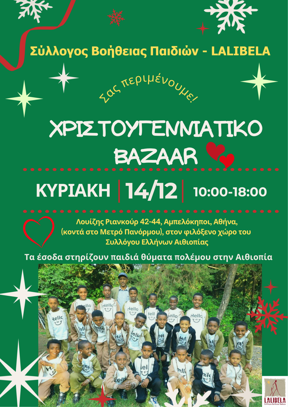 ΧΡΙΣΤΟΥΓΕΝΝΙΑΤΙΚΟ BAZAAR – ΣΥΛΛΟΓΟΣ ΒΟΗΘΕΙΑΣ ΠΑΙΔΙΩΝ LALIBELA -14/10/2025 -10-14:00
